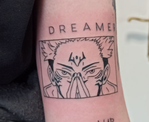 Tattoos, die Figuren eines Zeichentrickfilms/-Serie, Animes oder Comics zeigen, fallen in die Kategorie der Comic Tattoos. Dabei sind Außenlinien ein Muss. Oft wird mit einem Kontrast in Linienstärken gearbeitet um das Motiv besser herausstechen zu lassen. Mit der Hilfen von Farben oder Schattierungen kann dann Perspektive und 3-Dimensionalität hineingebracht werden. Allerdings werden Farben sehr flächig und nicht zu realistisch verwendet. Dabei ist es egal, ob die Farbgebung tatsächlich dem Charakter entspricht oder völlig frei gewählt ist. Comicmotive können aber genauso rein im Fineline Stil umgesetzt werden, wobei alle Linien so dünn wie möglich gehalten werden.
